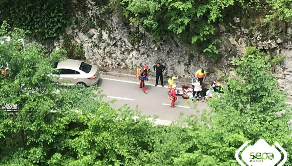 Efectivos del Grupo de Rescate del Servicio de Emergencias del Principado de Asturias (SEPA), a bordo del helicóptero medicalizado de Bomberos de Asturias, han evacuado a un varón que ha resultado herido tras sufrir un accidente con su moto en la Nacional 625, en punto kilométrico 130, en Ponga. El afectado, que presentaba un fuerte traumatismo en la espalda y en extremidad inferior izquierda, ha sido trasladado al Hospital Universitario Central de Asturias (HUCA). A expensas de más pruebas y hasta nueva valoración médica su pronóstico es reservado.