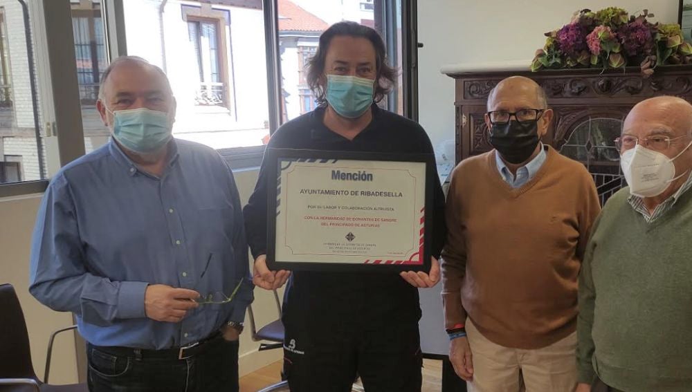 El alcalde de Ribadesella, Ramón Canal, y el teniente alcalde y concejal de salud, Luis Fuentes, recibieron de manos del presidente de la Hermandad, Luis Suárez Díaz y de su vicepresidente, Antonio López, el diploma de agradecimiento con el que la hermandad agradece la labor y colaboración altruista del ayuntamiento, y en extensión del municipio con las campañas de donación de sangre llevadas a cabo en el municipio.