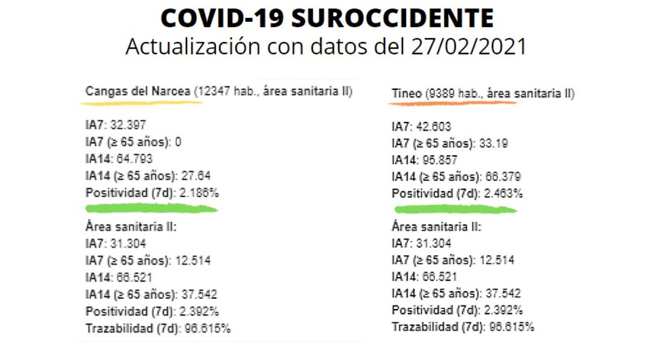 Los datos de los días 25 y 26 de febrero reflejan que se notificaron 4 casos en el Suroccidente, (2 en Cangas y 2 en Tineo), siendo el sábado 27 día con 0 casos en toda la comarca.