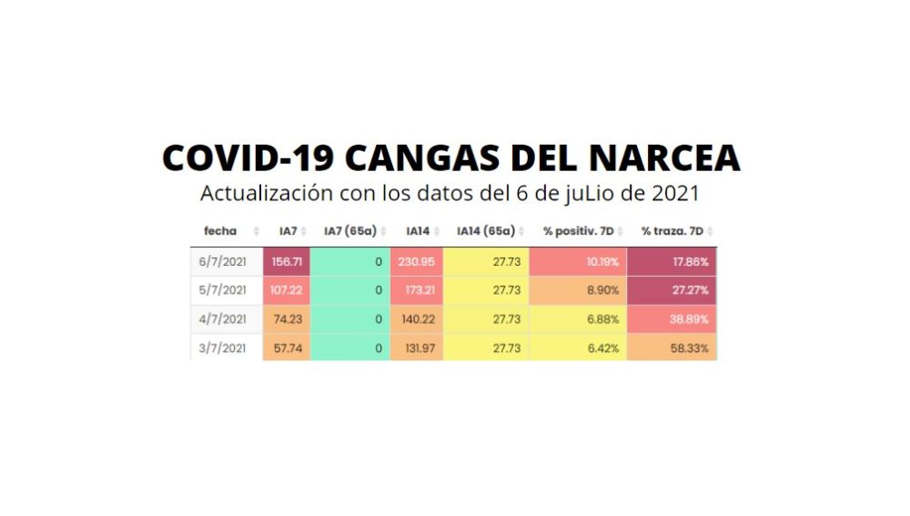La Incidencia Acumulada sube en Cangas del Narcea hasta los 230 casos por 100.000 habitantes en 14 días, en línea con la que presenta el Principado (233 casos) y España (252 casos), así mismo la trazabilidad baja al 17.86% y la positividad sube al 10%.