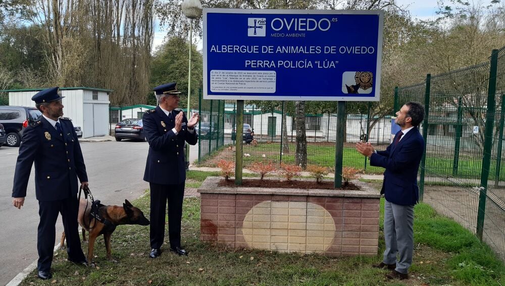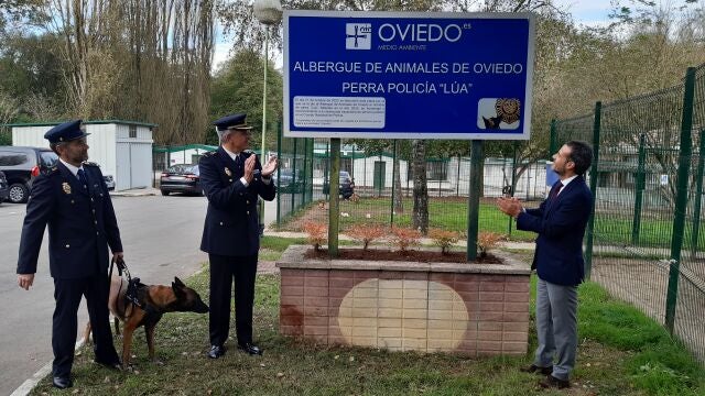 El Albergue de Animales de Oviedo se llama ya oficialmente ‘Perra Lúa’ en referencia a una perra que trabajó en la Policía Nacional durante 12 años en control de drogas. Responsables del cuerpo de seguridad y del Ayuntamiento de Oviedo acudieron al recinto de La Bolgachina para escenificar la nueva denominación de esta instalación.