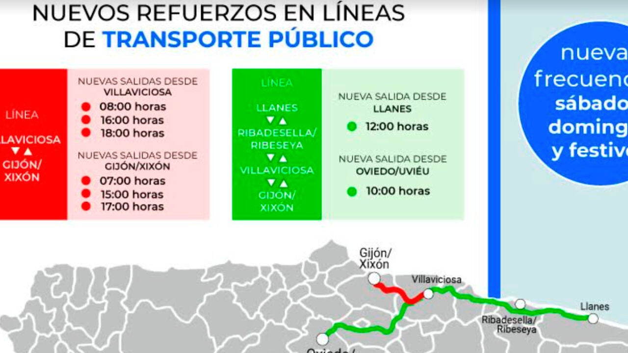 - Llanes-Ribadesella/Ribeseya-Villaviciosa-Oviedo/Uviéu. Se amplía la oferta con dos nuevas frecuencias con salidas a las 10:00 horas desde Oviedo/Uviéu y a las 12:00 horas desde Llanes. La línea realiza paradas en los concejos de Ribadesella y Villaviciosa.