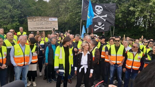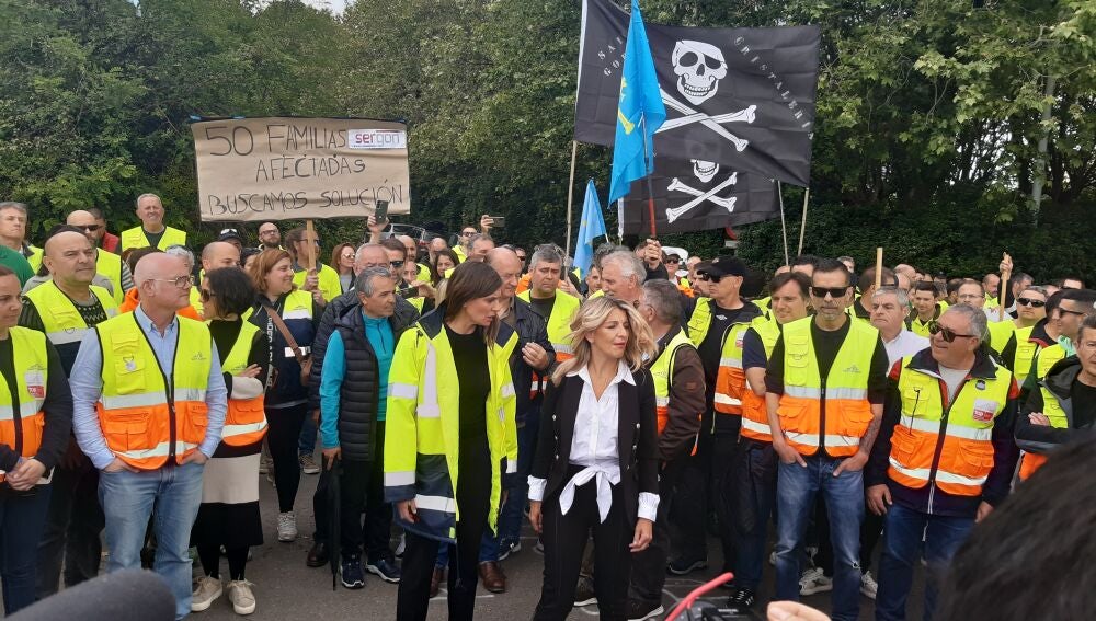 La vicepresidenta y ministra de Trabajo Yolanda Díaz hace suyas las exigencias de los trabajadores de Saint Gobain ante el ERE en Sekurit que supondría 160 despidos. Díaz mantuvo una reunión con el comité de empresa, no en la planta de Avilés porque la dirección no le dejó sino en la casa sindical y luego estuvo en una concentración a las puertas de la fábrica.