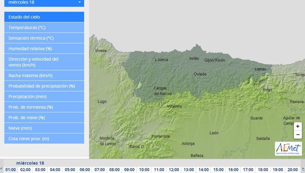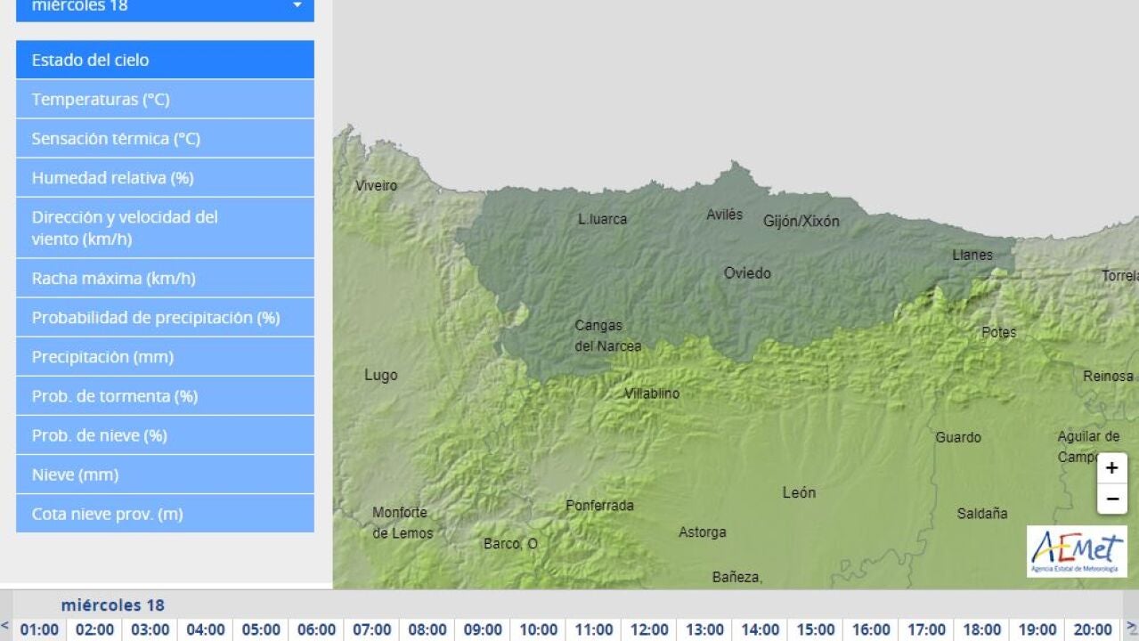 La Agencia Estatal de Meteorología prevé para hoy, miércoles, día 18 de mayo de 2022 en Asturias Nuboso o cubierto, con aumento de las nubes de evolución en el interior. No se descartan chubascos con tormenta en la Cordillera durante la segunda mitad del día.