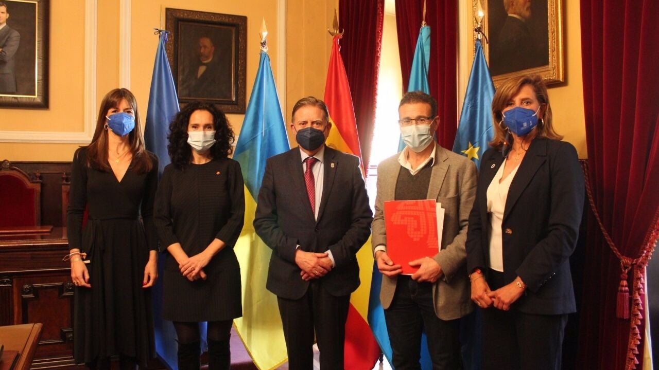 El Alcalde de Oviedo, Alfredo Canteli, y las concejalas de Políticas Sociales del Ayuntamiento de Oviedo, Concepción Méndez y Leticia González, se reunieron con Aurora García García, Directora de Cáritas Diocesana, y Ramón Méndez-Navia, secretario General de Cáritas Diocesana.