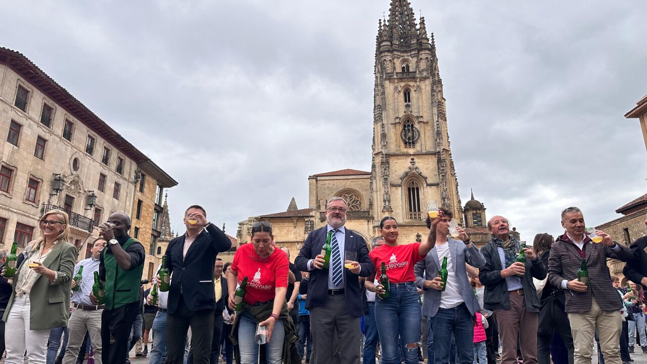 La Plaza de la Catedral de Oviedo ha reunido este lunes a centenares de personas que se han congregado para celebrar el Día Mundial de la Sidra con un escanciado simultáneo de esta bebida tradicional asturiana.