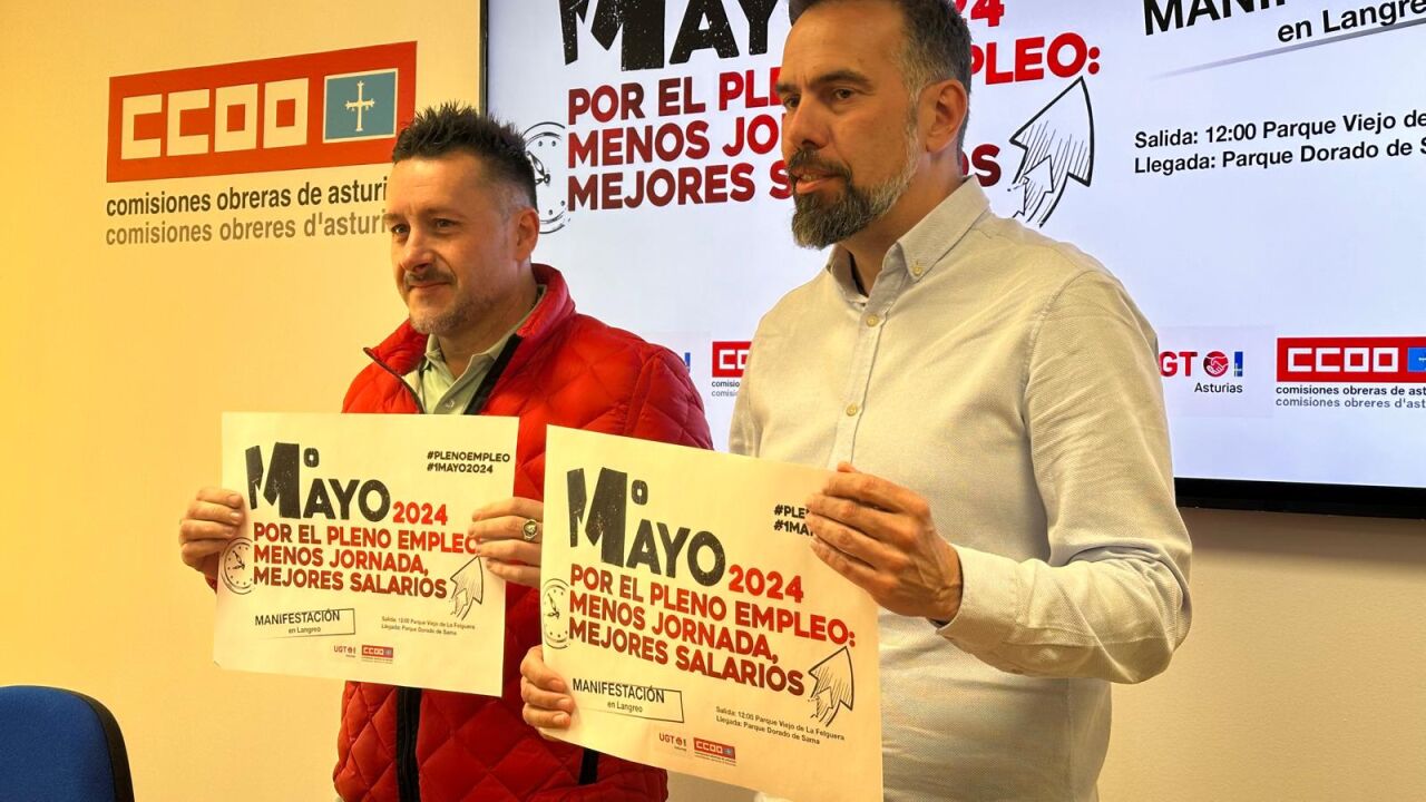 Los secretarios generales de UGT y CCOO de Asturias, Javier Fernández Lanero y José Manuel Zapico respectivamente han presentado este jueves la manifestación del 1 de mayo en Asturias que esta vez lleva por lema 'Por el pleno empleo: menos jornada, mejores salarios" y que tendrá a Langreo como escenario. La manifestación saldrá a las 12.00 del Parque Viejo de la Felguera y acabará en el Parque Dorado de Sama y los sindicados consideran que "hay muchas razones" para participar en la misma.