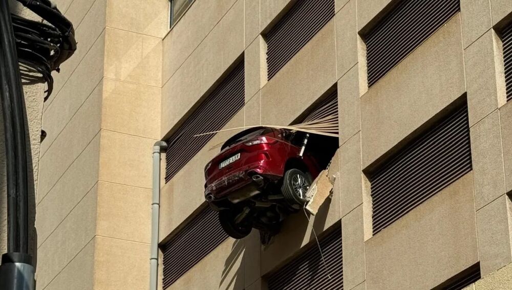 En torno a las 09.45 horas de este jueves 01 de agosto un vehículo ha quedado suspendido en el aire a la altura de la tercera planta de un aparcamiento de la calle Ignasi Wallis, encima del Registro y detrás de los antiguos juzgados, en pleno centro de la ciudad de Ibiza.