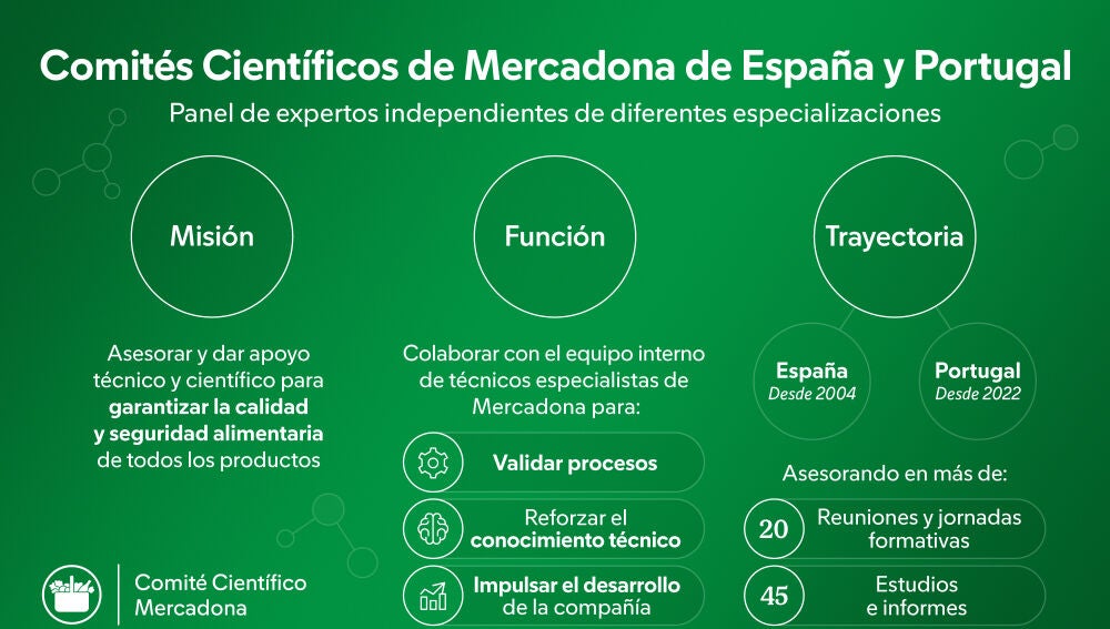 Estos “comités de sabios”, formados por científicos de diferentes especializaciones, prestan formación, información, apoyo técnico y asistencia científica en distintas especialidades, con el objetivo de garantizar la máxima calidad con seguridad alimentaria en los procesos y productos de la compañía. En lo que respecta a la composición de ambos Comités Científicos, a los científicos mencionados se suman, en España: José Juan Rodríguez, doctor en veterinaria y experto microbiólogo (Universidad Autónoma de Barcelona); Ana Canals, doctora en Ciencias Biológicas (Universidad Complutense de Madrid); Arturo Anadón, doctor en Veterinaria (Universidad Complutense de Madrid); Andrés Otero, doctor en Veterinaria (Universidad de León); Andreu Palou, doctor en Bioquímica (Universidad de Islas Baleares); Juan José Badiola, doctor en Veterinaria (Universidad de Zaragoza) y actual presidente del Comité; Pilar Vinardell, doctora en Farmacia (Universidad de Barcelona) y José Miguel Mulet, doctor en Bioquímica y experto en Biología Molecular (Universidad Politécnica de Valencia). Integran el Comité Científico de Mercadona en Portugal: Alexandra Silva, experta en Ciencias Farmacéuticas (Facultad de Farmacia de Lisboa), Paula Teixeira, experta en Microbiología y doctora en biotecnología (Universidad Católica Portuguesa), Fernanda Vilarinho, doctora en Ingeniería de los Materiales (Instituto Superior Técnico de la Universidad de Lisboa), Sandra Chaves, doctora en biología (Universidad de Lisboa), Inês Pádua, doctora en Ciencias de la Nutrición (Universidad de Porto) y Duarte Torres, doctor en Ciencias e Ingeniería Química y Biológica (Universidad de Porto).