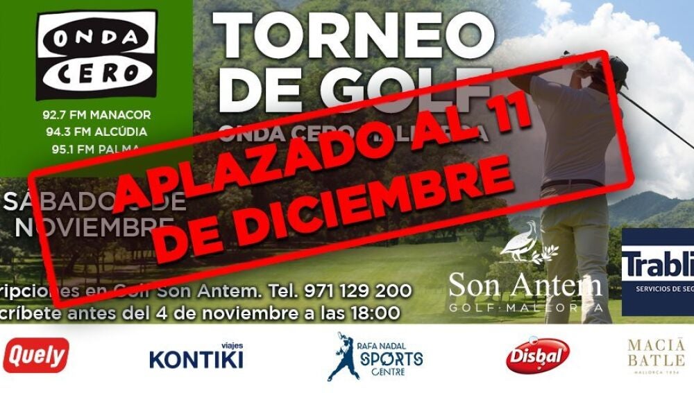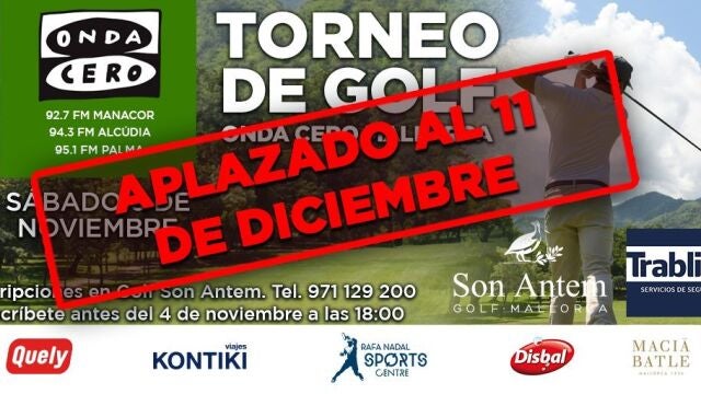 El Torneo de golf de Onda Cero Mallorca se ha pospuesto nuevamente debido a las condiciones meteorológicas que hacen inviable disputar la prueba en la fecha prevista, por lo que se celebrará el sábado 11 de noviembre de 2021.