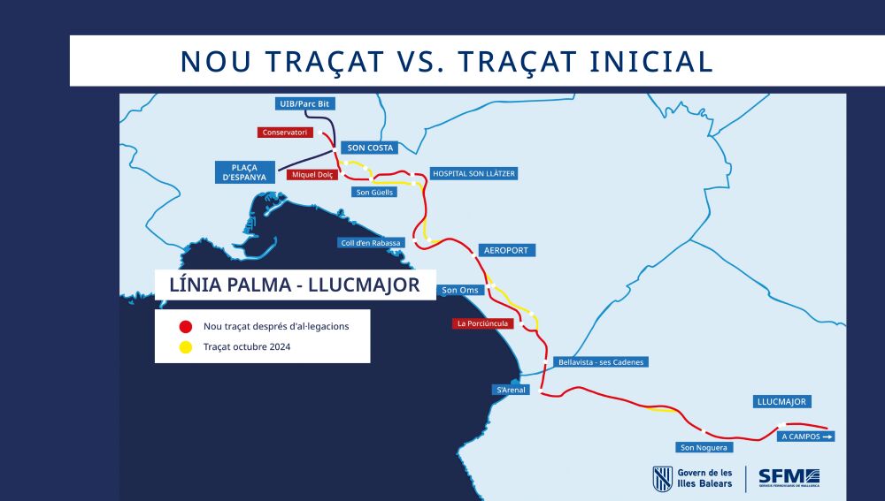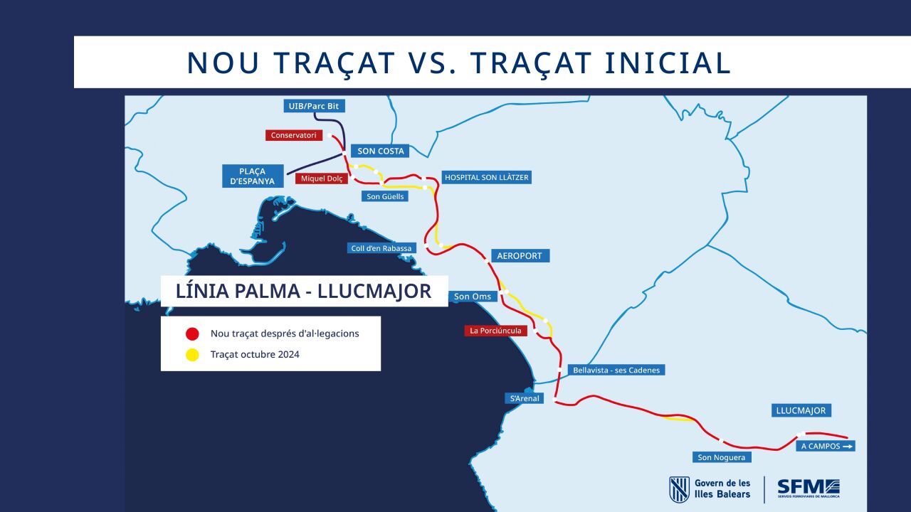 La línea comenzará en la zona del Conservatorio Superior de Música de les Illes Balears, extendiendo el tramo soterrado 1,2 km y acercando el tren al futuro Distrito de las Artes de Palma. Además, se han modificado ubicaciones de estaciones, acercando el tren a zonas como Platja de Palma, Pere Garau y Coll d'en Rabassa. Destaca la nueva estación en la plaza de Miquel Dolç, en sustitución de la prevista en la plaza de Orson Welles, y la nueva ubicación de la parada de la Platja de Palma, en la Porciúncula en vez del Pil·larí. También se ha buscado una mayor integración del tren en la trama urbana, con ajustes en el entorno del Hospital Universitario Son Llàtzer y en s'Arenal de Llucmajor.