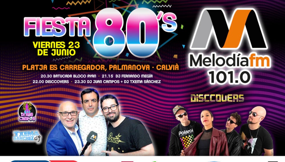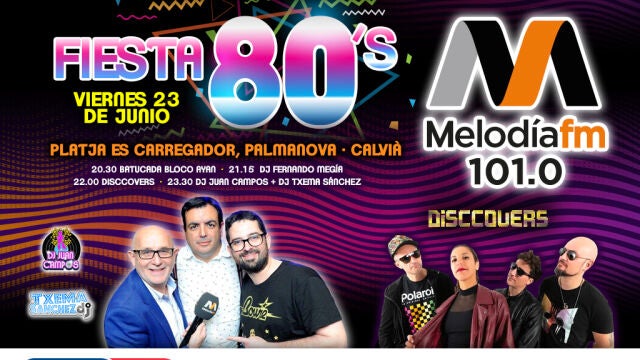¡Vuelve la fiesta de los ochenta de Melodía FM con Juan Campos en Calvià, con entrada gratuita! El próximo viernes, 23 de junio de 2023, se celebra la noche de San Juan en la playa Es Carregador de Palmanova, en el municipio mallorquín de Calvià. En esta ubicación la emisora musical Melodía FM ha organizado una fiesta de los ochenta, con la música del DJ Juan Campos.