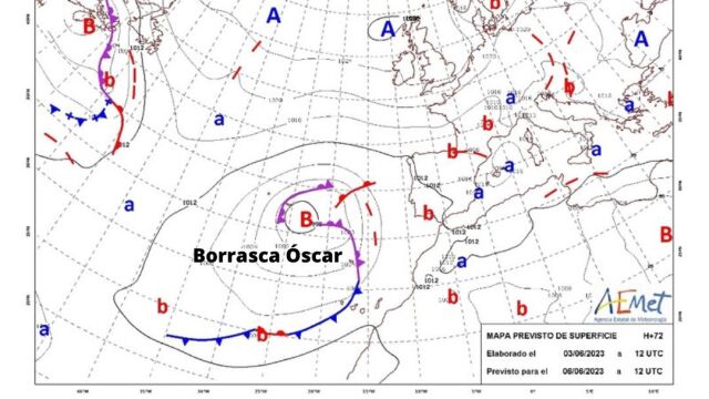 La borrasca Óscar, que en realidad se trata de sucesivas pequeñas bajas en latitudes subtropicales dentro de la gran borrasca, con sus frentes asociados y alto contenido en humedad, se desplazá durante el martes hacia el norte, permaneciendo sobre la península y Baleares durante varios días, posiblemente hasta el fin de semana.