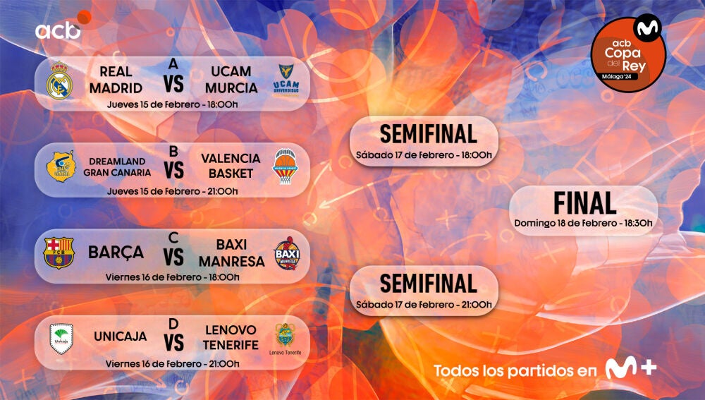 El partido del 'Granca' contra los valencianos se jugará el jueves 15 de febrero a partir de las 20:00 horas, mientras que los tinerfeños se medirán al Unicaja el viernes, día 16, en el mismo horario. Se da la circunstancia de que el conjunto canarista tendrá enfrente al anfitrión y vigente campeón de la Copa del Rey, reeditando la final entre andaluces y tinerfeños de la edición de 2023.