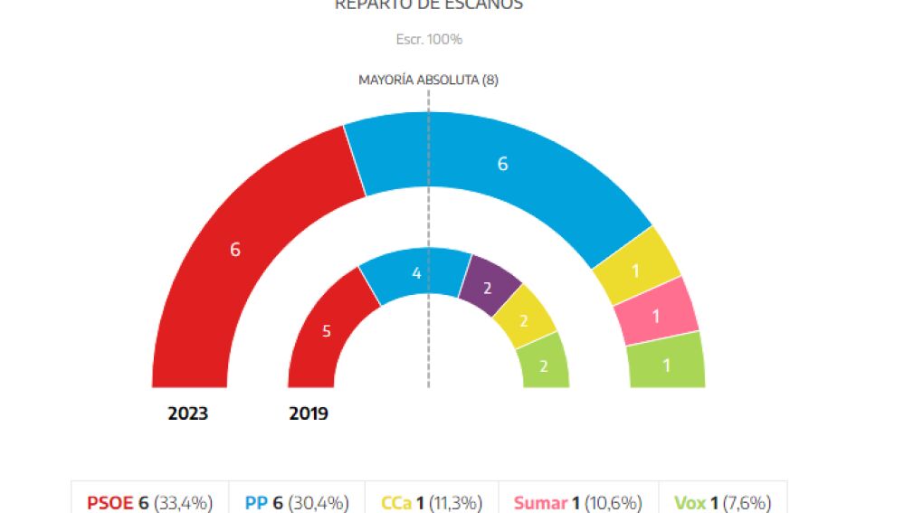 La formación de Yolanda Díaz, SUMAR, perdería un diputado en Canarias frente al resultado de Podemos en 2019, lo mismo que Vox en el archipiélago. En el caso de SUMAR es Noemí Santana la que se va al Congreso y Alberto Rodríguez quien se queda fuera.