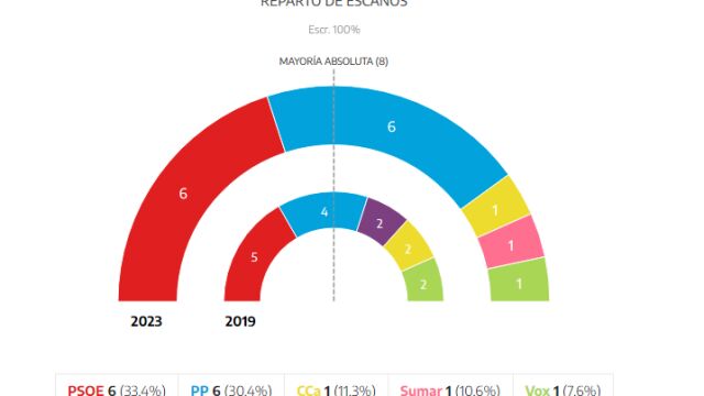 En Canarias, con el 100% escrutado, el PSOE repite su resultado de 2019 con un total de 7 senadores y consolida una victoria clara frente a un PP que se queda con 2 sillones tras perder uno.