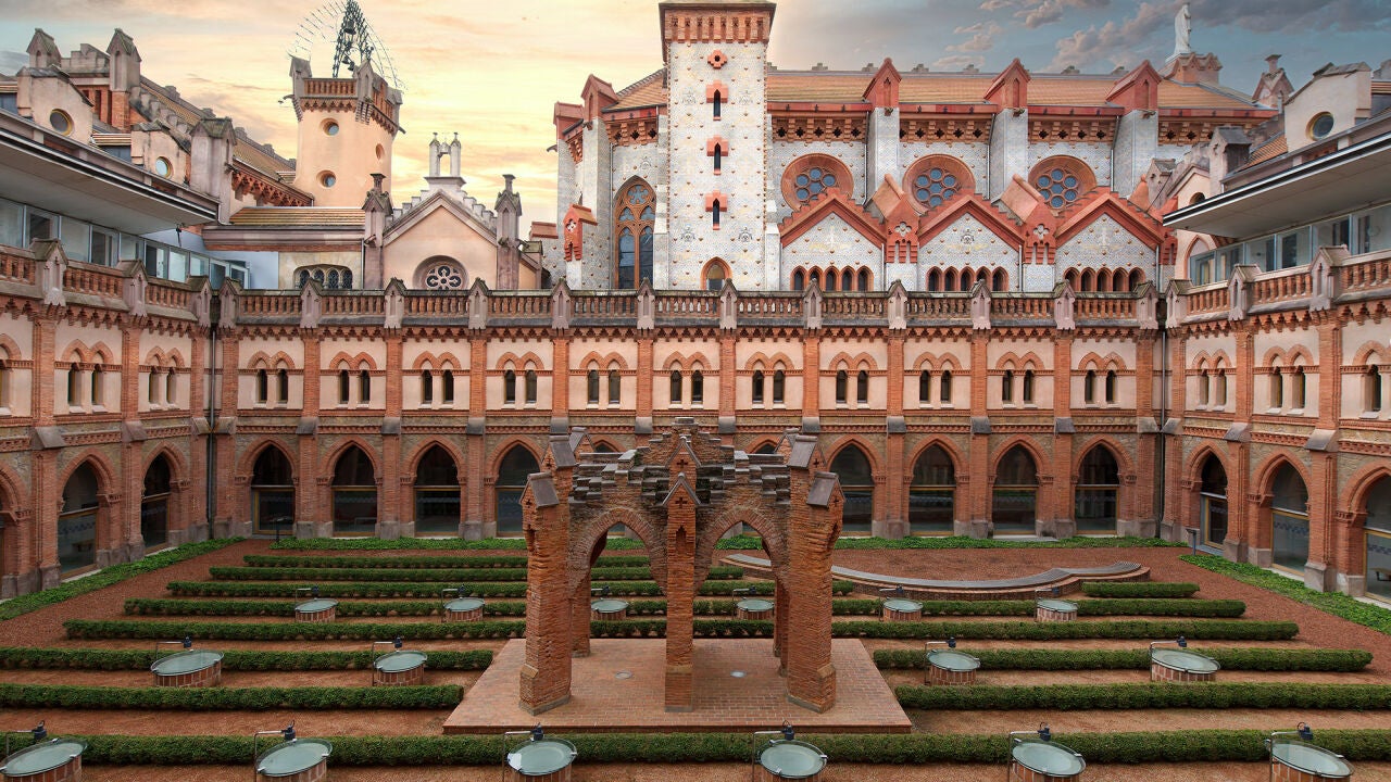 El edificio accediendo por la Puerta de las Virtudes, el vestíbulo, escalera y nártex, el paraninfo, la capilla privada, la sacristía, la iglesia y el claustro.