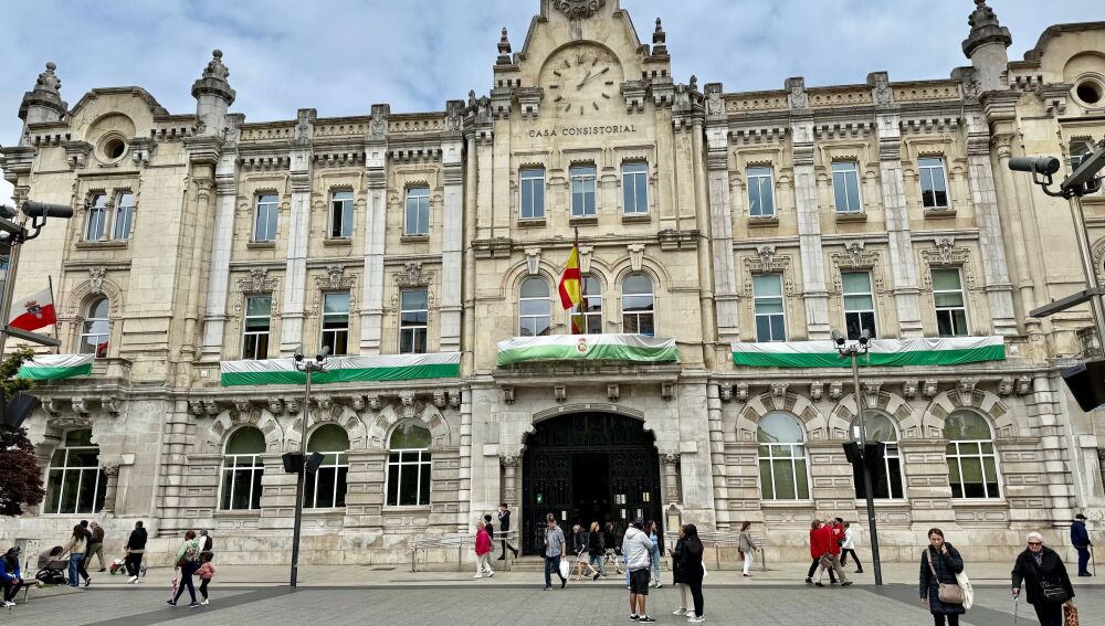 El balcón del Ayuntamiento de Santander se ha ‘vestido’ de verdiblanco como muestra de apoyo al equipo de cara al decisivo encuentro contra el Granada de este domingo en El Sardinero, para certificar el play off de ascenso.