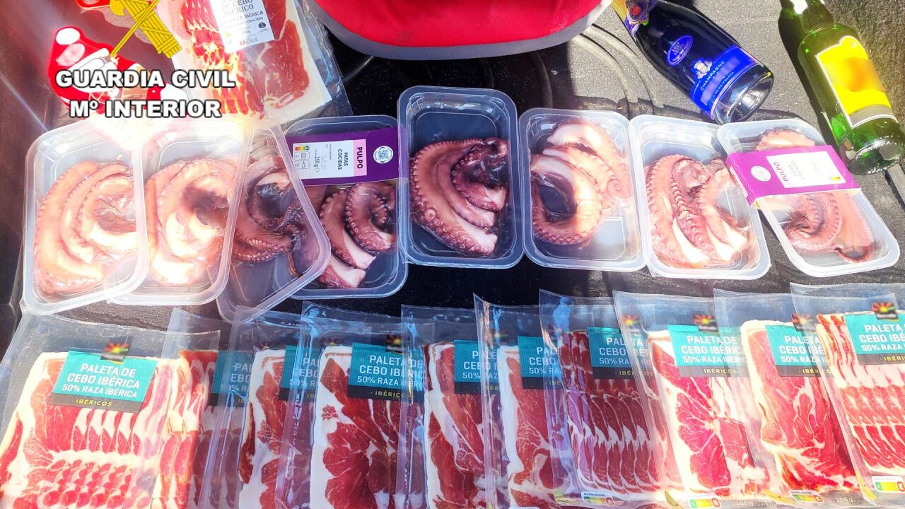 En concreto, en el maletero había 15 sobres de paleta y jamón de cebo ibérico, ocho envases de 250 gramos cada uno con patas cocidas de pulpo, una botella de whisky, otra de champán francés, así como un bote de chocolatinas.