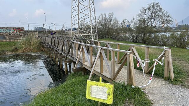 La Policía Local de Camargo ha precintado una pasarela de madera que se ubica en el Parque Pequeños Cachoneros, en la zona de las antiguas marismas de Cacho, bajo la cuál discurre la Ría del Carmen.