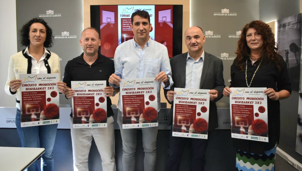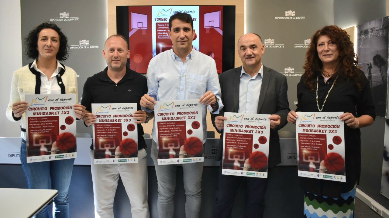 El Circuito de Promoción de Minibasket 3x3, que se desarrollará durante el mes de octubre en diferentes localidades de la provincia de la mano de la Federación de Baloncesto de Castilla-La Mancha y con la colaboración de Globalcaja. Se celebró en Tobarra el pasado día 5 y se volverá a celebrar el 19 en Higueruela, y en Villarrobledo el sábado 26 de octubre, ubicaciones que acogerán esta competición que nace con vocación de permanencia para seguir llegando a otros puntos de la geografía albacetense. A la presentación también han asistido el presidente de la propia Federación, José Esteban Gálvez; y las alcaldesas y el alcalde de las localidades protagonistas: Manuela Garrido, Isabel Martínez y Valentín Bueno, respectivamente.