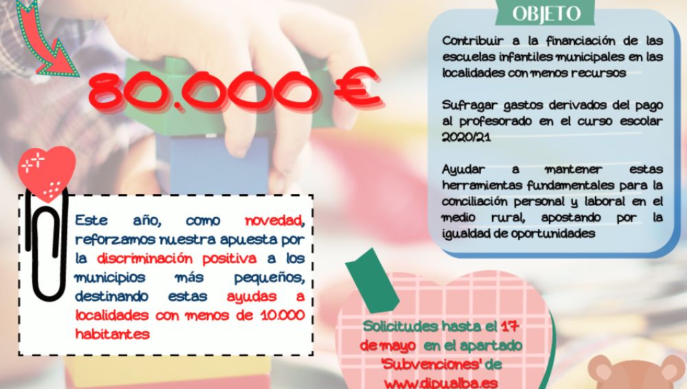 El Boletín Oficial de la Provincia (BOP) ha publicado este lunes, 26 de abril, la Convocatoria de Ayudas a Ayuntamientos que la Diputación de Albacete dispone para contribuir a la financiación de las Escuelas Infantiles municipales durante el curso 2020/21. Dotadas con un montante total de 80.000 €, las subvenciones podrán solicitarse desde este martes, 27 de abril, hasta el lunes 17 de mayo (ambos incluidos).
