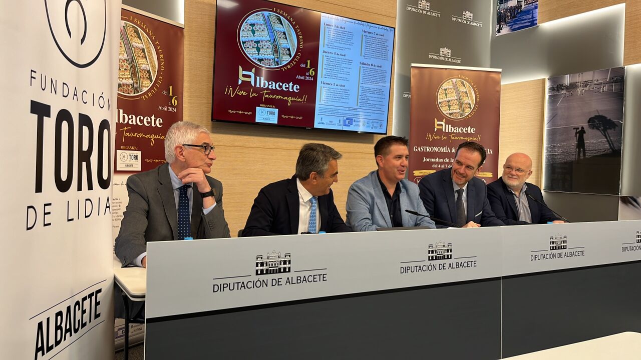 La primera Semana Taurino-Cultural se celebrará en la capital albaceteña del 1 al 6 de abril, bajo el lema ‘Albacete, Vive la Tauromaquia’. Este evento, pionero en su género, ha sido impulsado por la Fundación Toro de Lidia con el apoyo de todas las instituciones representativas del territorio: la propia Diputación, la Junta de Comunidades de Castilla-La Mancha y el Ayuntamiento de Albacete. Y representantes de todas ellas asistieron a esta ‘puesta de largo’ de la iniciativa: Santiago Cabañero, como presidente provincial; Victorino Martín, como cabeza de la Fundación Toro de Lidia; Antonio Martínez Iniesta, en calidad de coordinador del Capítulo del Toro de Lidia en Albacete; Pedro Antonio Ruiz Santos, al frente de la Delegación Provincial de la JCCM; y Alberto Reina, como segundo teniente de alcalde y concejal de Coordinación General de Funcionamiento del Gobierno Municipal en el Ayuntamiento de Albacete.