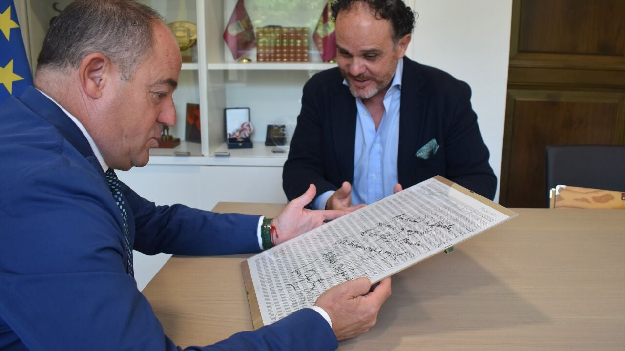 El alcalde de Albacete, Emilio Sáez, ha recibido la cuarta hoja del manuscrito de la obra ‘Canto a Castilla-La Mancha’ del compositor José Zárate, estrenada en nuestra ciudad en el XXX Encuentro Coral San Juan 2022, celebrado recientemente en el Teatro Circo y en el que participaron el Orfeón de La Mancha y los coros más representativos de la provincia de Albacete.