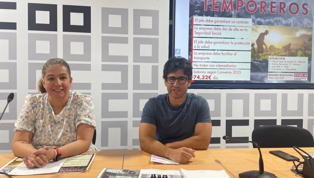 El secretario general de CCOO Albacete, Paco Gómez, y Ana María Marín, de la Federación de Industria, han presentado una campaña promovida desde el sindicato con un doble objetivo: el primero, informar a las personas temporeras de cuáles son sus derechos; y el segundo, concienciar a las personas empleadoras de cuáles son sus obligaciones.