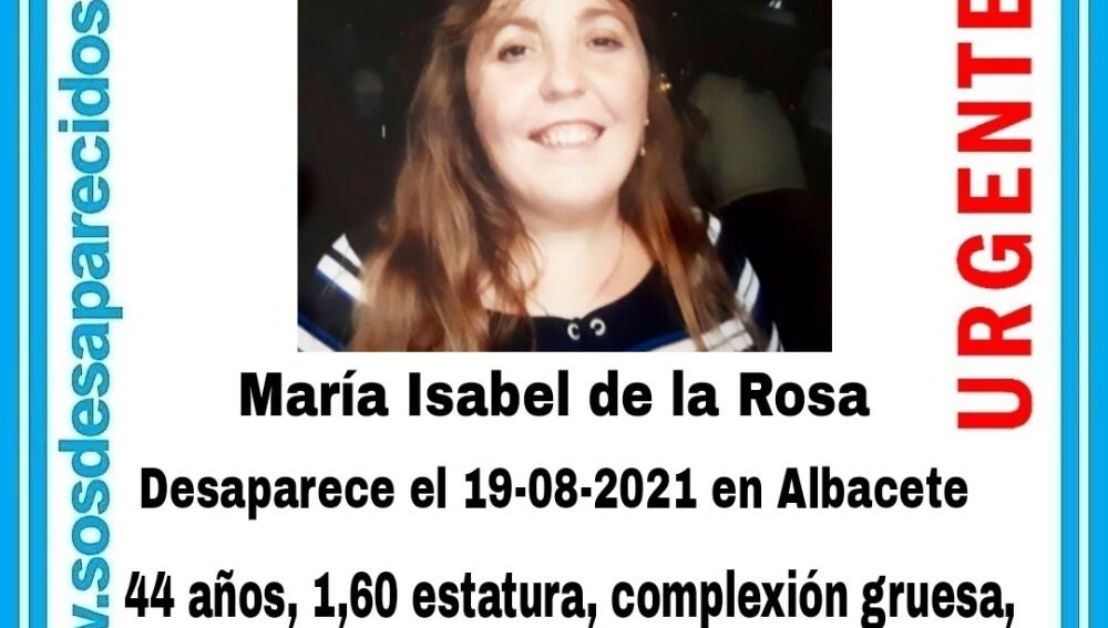 María Isabel de la Rosa tiene 44 años y trabaja como vendedora de la ONCE en la capital, sobre todo en la zona de Avenida de España y el Parque Abelardo Sánchez , donde es muy conocida y apreciada por la labor que desemplea. La asociación SOS Desaparecidos se ha hecho eco de la denuncia de la familia y ha realizado un hace un llamamiento para tratar de localizar a María Isabel de la Rosa , y ofrece una serie de datos para ayudar a identificarla: Mide 1,60 de estatura y pesa en torno a los 79 kilos. Es de complexión gruesa, tiene el pelo rubio y largo, y ojos castaños, además padece una cojera en la pierna derecha.
