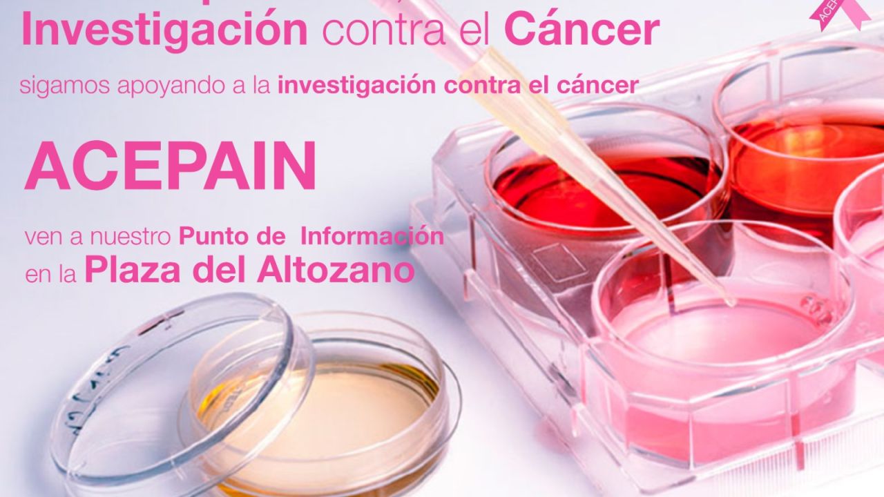 Acepain, asociación que lucha contra el cáncer de mama, ha organizado para esta jornada una mesa informativa de cuestación fundamental para continuar con los proyectos necesarios para mejorar los tratamientos de la enfermedad, punto que estará instalado durante todo el día en la Plaza del Altozano. Desde Acepain, consideran que gracias las nuevas tecnologías y los avances de la ciencia se detectan más pacientes oncológicos precoces, aunque hace falta seguir mejorando para que aumenten las alternativas de tratamiento y la esperanza de vida de los pacientes, y recuerdan que sin investigación no hay futuro, no hay vida.