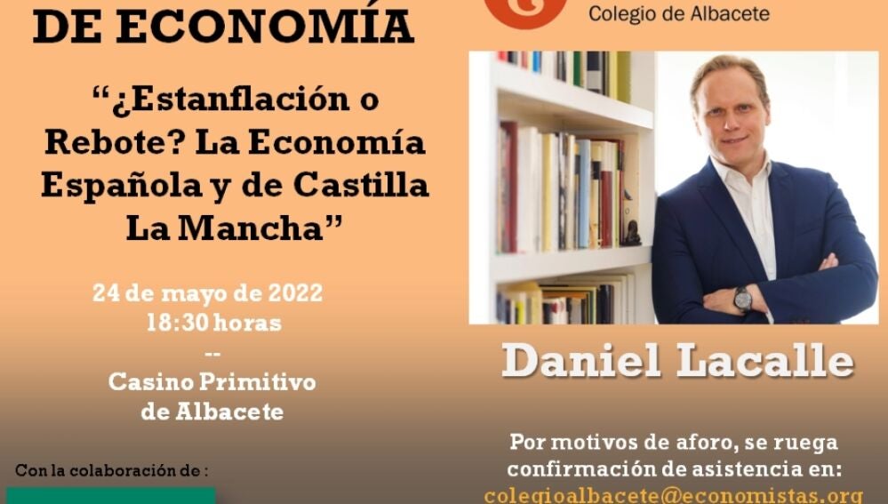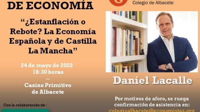 En el ciclo, que organiza el Colegio de Economistas de Albacete, el prestigioso economista Daniel Lacalle ofrecerá una conferencia titulada: ‘¿Estanflacion o rebote? La economía española y de Castilla La Mancha’ que tendrá lugar el próximo martes 24 de mayo a las las 18.30h en el Casino Primitivo de Albacete. La conferencia será introducida y presentada por el decano del Colegio de Economistas de Albacete, Manuel González Tébar, quien dará paso a la charla que tratará de aclarar y abvanzar conceptos sobre un asunto que, en materia económica, está centrado la actualidad informativa desde hace tiempo.
