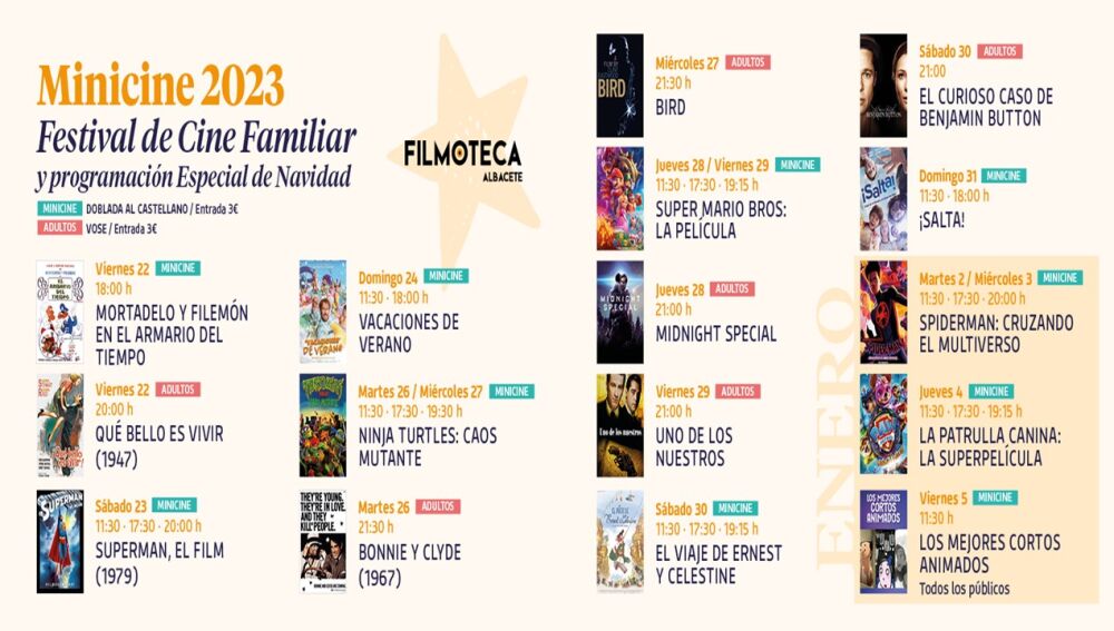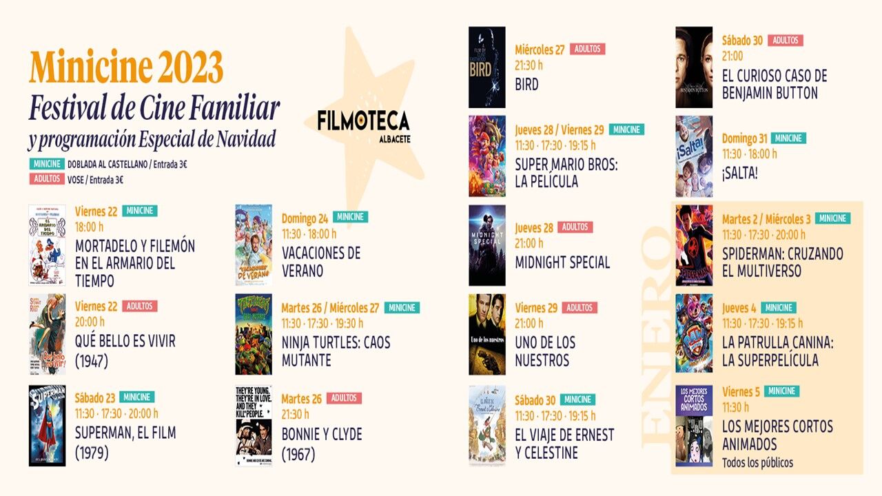 Ya para el año 2024, se reanudan las proyecciones con más cine infantil: el martes 2 y el miércoles 3 de enero, seis pases de “Spiderman: cruzando el multiverso” en horario de 11:30, 17:30 y 20:00. El jueves día 4, “La patrulla canina: la superpelícula” (11:30, 17:30 y 19:15 horas), y la víspera de Reyes, viernes día 5 a las 11:30, matinal para todos los públicos con “Los mejores cortos animados”, un aperitivo a la Cabalgata de Reyes.