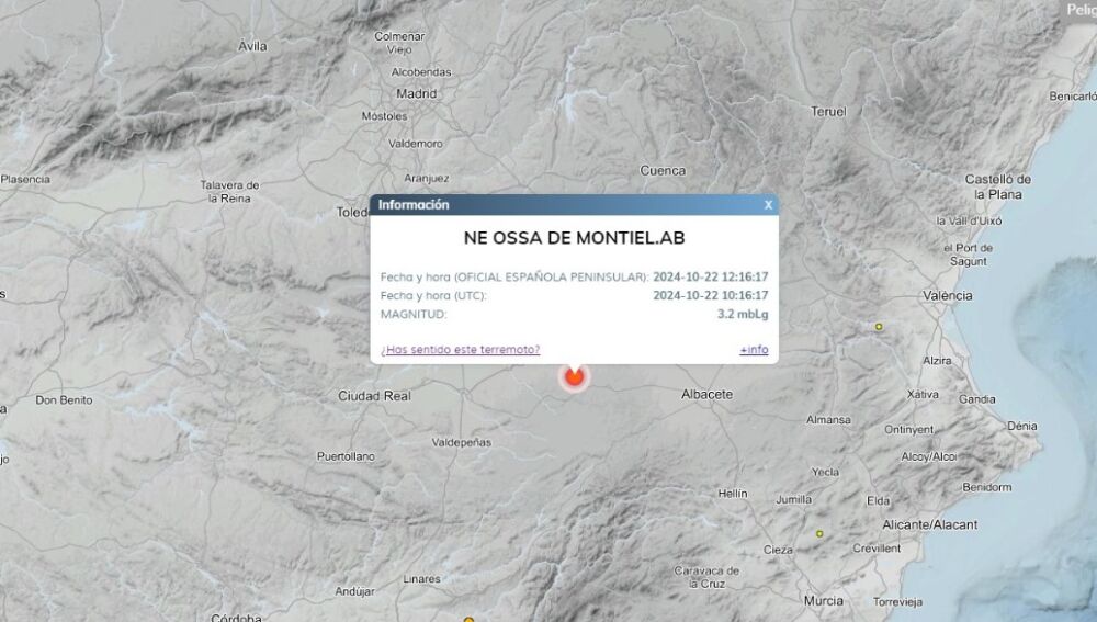Según ha registrado el Instituto Geográfico Nacional, el terremoto ha sido de magnitud 3,2 y no ha ocasionado daños. El primero se ha detectado a las 12:16 horas de este martes 22 de octubre. Después, han podido notar dos réplicas y ha llegado también hasta el término municipal de El Bonillo y Munera.