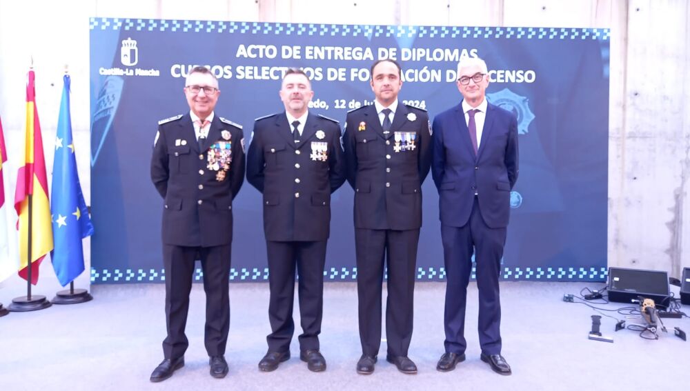 El concejal de Seguridad, Alberto Reina, ha felicitado en nombre del Ayuntamiento a los dos nuevos inspectores de la Policía Local de Albacete, Luciano Rosillo Gómez y Mario Adolfo Rubio Lara, durante el acto de entrega de diplomas que esta mañana ha tenido lugar en el Archivo Regional de Toledo.