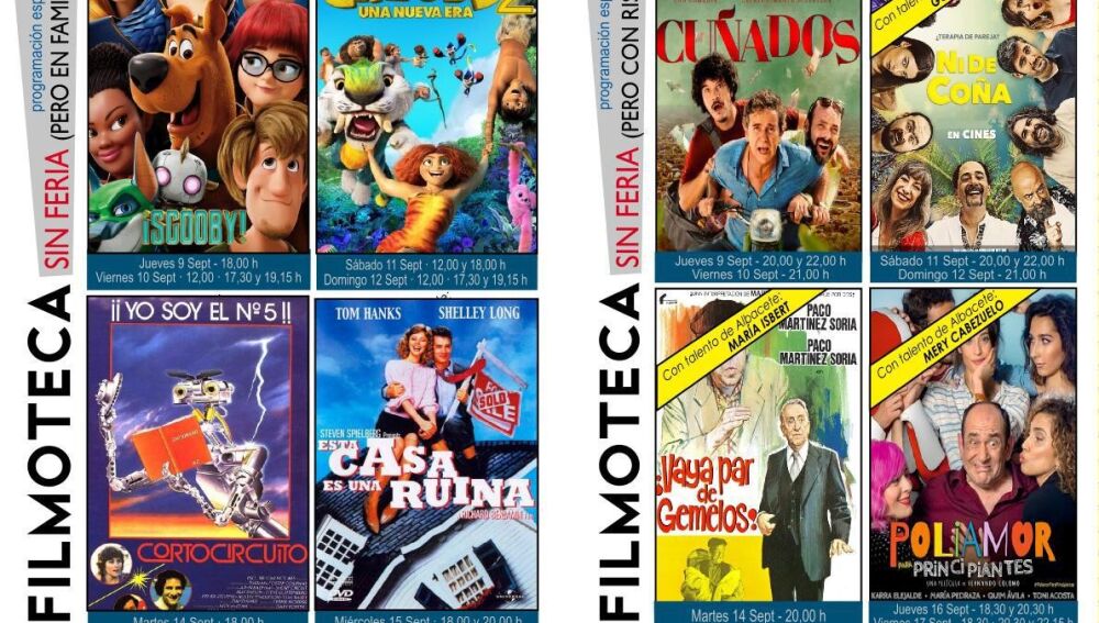 Además de estos títulos, Filmoteca Municipal recurre a la comedia en sus sesiones de noche: “Cuñados”, el éxito sorpresa del cine español, llega para entregarnos carcajadas los días 9 y 10, cogiendo el relevo la disparatada “Ni de coña”, con Goyo Jiménez protagonizando una loca terapia de parejas los días 11 y 12. Para el día 14 volvemos la mirada al pasado y recordamos la maestría de María Isbert, con su divertido acento maño en “¡Vaya par de gemelos!”, al lado de Paco Martínez Soria. Finalizará la programación especial la última comedia de Fernando Colomo, “Poliamor para principiantes”, donde interviene una albaceteña curtida en el teatro que ahora se adentra en el cine, Mery Cabezuelo. La película que protagonizan los populares Karra Elejalde y Toni Acosta se verá los días 16 y 17 de septiembre.