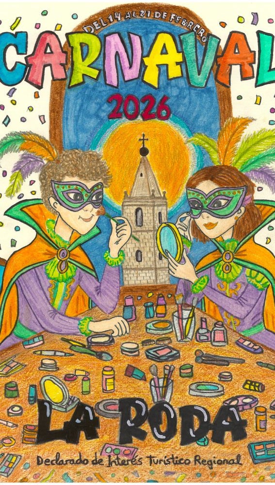 Por otro lado, se ha dado a conocer el cartel oficial del Carnaval de La Roda 2026, cuya forma de elección ha sido también este año una novedad, ya que ha sido elegido mediante un concurso en el que ha participado alumnado de los institutos de educaciósecundaria de la localidad, con el objetivo de “fomentar la creatividad artística y la implicación de los más jóvenes en la vida cultural del municipio”, según ha señaló Fernández. La elección se llevó a cabo el pasado 23 de enero tras valorar un total de 17 trabajos representativos de todos los IES de La Roda. El jurado estuvo compuesto por dos representantes del Ayuntamiento, dos profesores de Plástica de los institutos locales y dos miembros de la Asociación Amigos del Carnaval.Tras un proceso de selección en varias fases, el jurado decidió por unanimidad que el cartel ganador fuera el presentado por Natalia del Carmen Carrilero Moreno, alumna de 2º A de ESO del IES Doctor Alarcón Santón, cuya obra ilustrará la portada del programa oficial de actos del Carnaval 2026. Asimismo, se concedió una Mención Especial a la obra presentada por Eva Arenas Martínez, alumna de 3º D del mismo centro educativo.