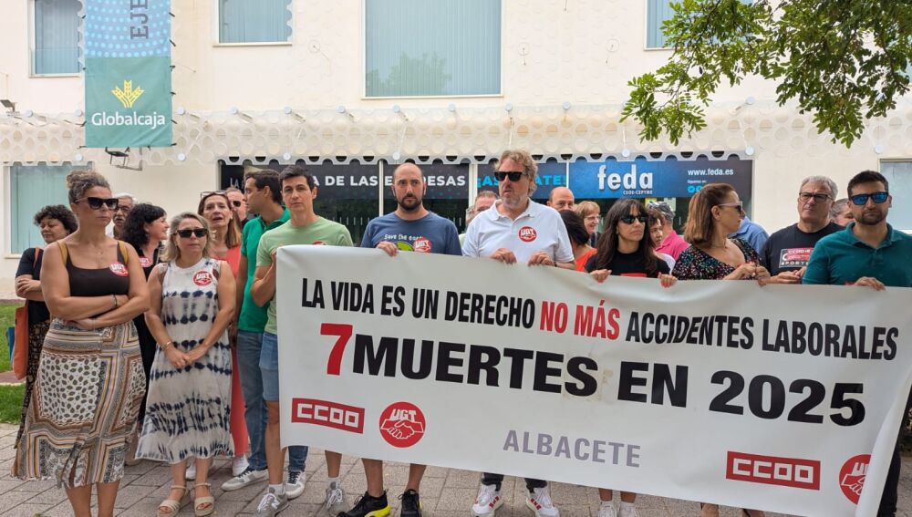 Ha tenido lugar segunda concentración de la semana ante la sede de FEDA , convocada por UGT y CCOO, en recuerdo al trabajador que perdió la vida este miércoles en la localidad albaceteña de Ayna. La cuarta muerte por accidente laboral que se registra en la provincia en lo llevamos de agosto, que se ha convertido ya en un mes negro para la provincia.