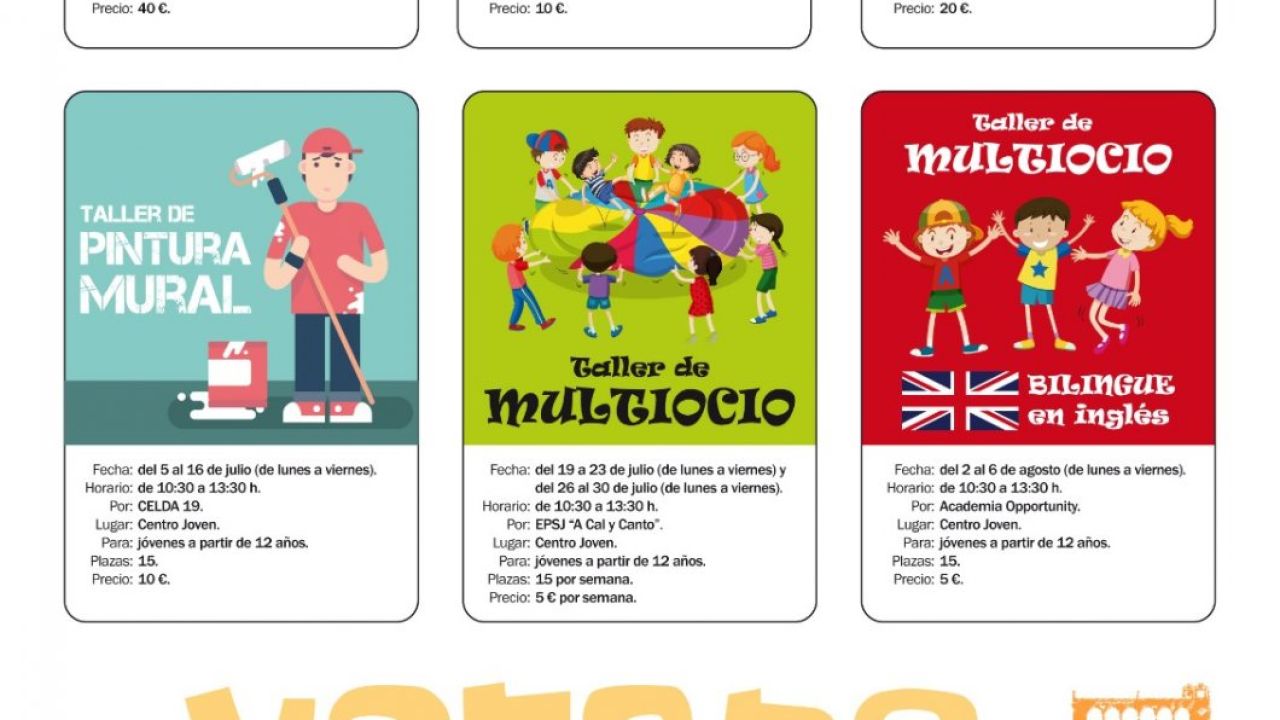 Por otro lado, se han programado talleres para jóvenes de entre 12 y 16 años como el de pintura mural a cargo del colectivo CELDA 19 y dos talleres de multiocio, uno de ellos bilingüe para fomentar el uso del inglés.