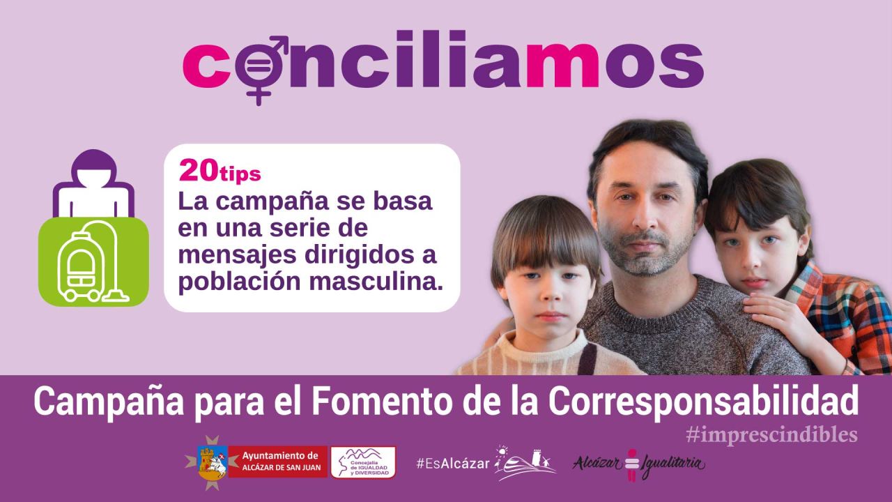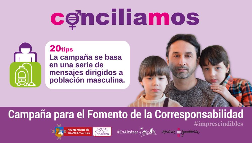 La campaña Conciliación y Corresponsabilidad Masculina, lleva el lema “Conciliamos” y consiste en lanzar periódicamente, a través de las redes sociales una serie de mensajes dirigidos a la población masculina con el objetivo de mejorar la conciliación y favorecer la reflexión en las familias. Un paso, el de la corresponsabilidad, #Imprescindible para avanzar en la igualdad.
