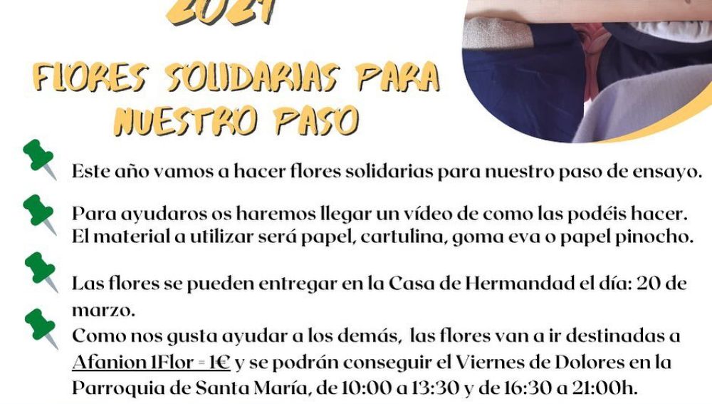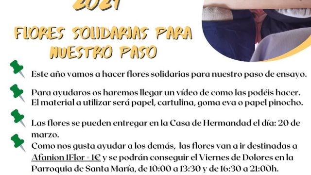 Este año la actividad va a consistir en realizar flores solidarias para el paso de ensayo, y las mismas se podrán conseguir el viernes de Dolores en la Parroquia de Santa María en horario de 10:00 a 13:30 y de 16:30 a 21:00 h., siendo el donativo de 1 € que irá destinado a la asociación AFANION de nuestra localidad.