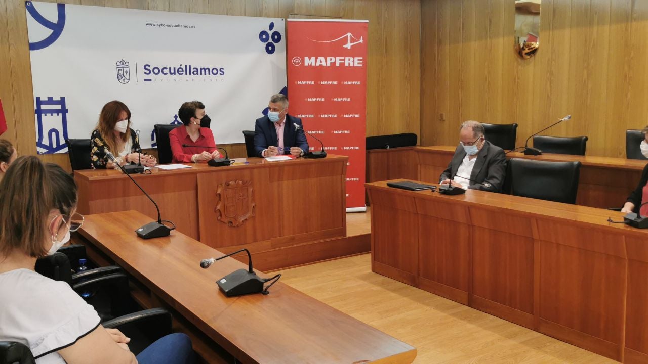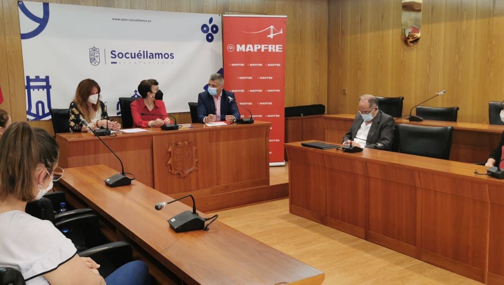 La alcaldesa de Socuéllamos, Elena García, la presidenta de Afymos, Pilar Alarcón, y el representante de la Fundación Mapfre, José Alfonso Pérez, han firmado un convenio de colaboración a tres bandas que permitirá que alumnos y alumnas que están recibiendo formación en los servicios de capacitación de Afymos realicen prácticas en el Ayuntamiento de Socuéllamos.