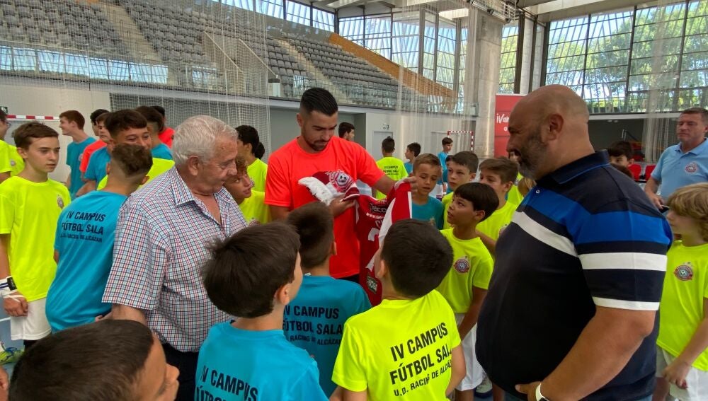 La visita de un jugador internacional ha sido uno de los atractivos programados en el Campus de futbol sala que se está celebrando en Alcázar de San Juan. Javier García, conocido como Chino, ha hecho las delicias de los chavales que han podido disfrutar de su juego, de sus consejos y de su presencia. El jugador ha recibido una camiseta de recuerdo del campus y ha compartido fotografía con los asistentes a este encuentro anual al que acudía el concejal de Deportes, Javier Ortega,
