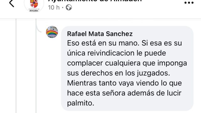 Así lo ha manifestado, a su vez, la primera edil en sus perfiles personales donde ha recogido como Rafael Mata hace afirmaciones del tipo “vaya viendo lo que hace esta señora además de lucir palmito” o apreciaciones respecto de su aspecto físico con comentarios como “ya sabemos que tiene buen fondo de armario”.