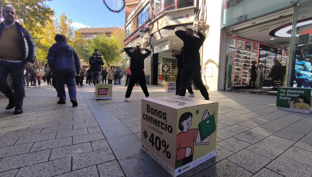 Un flashmob protagonizado por bailarines de la escuela Musicaula en la confluencia de la calle General Aguilera con la Plaza del Pilar ha dado el pistoletazo de salida a la campaña de los “Bonos comercio” que lanza nuevamente el Ayuntamiento de Ciudad Real a través del Instituto Municipal de Promoción Económica, Formación y Empleo (IMPEFE) con el objetivo de reactivar las ventas en el pequeño comercio a las puertas de la campaña de Navidad.