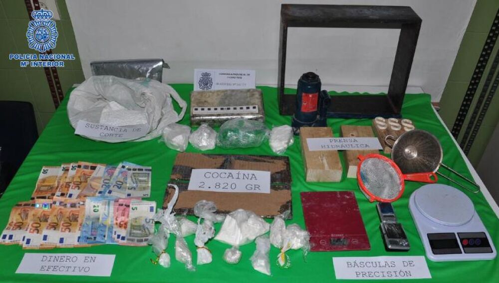 En el interior del garaje se localizaron otros 440 gramos de cocaína, 935 euros, un laboratorio para el procesamiento de la droga, cinco básculas de precisión, una prensa hidráulica y complementos para la confección de paquetes de un kilo de cocaína, acetona y otros químicos para el procesado de los estupefacientes, así como sellos de metacrilato para imprimir la “marca” de calidad a sus compradores.
