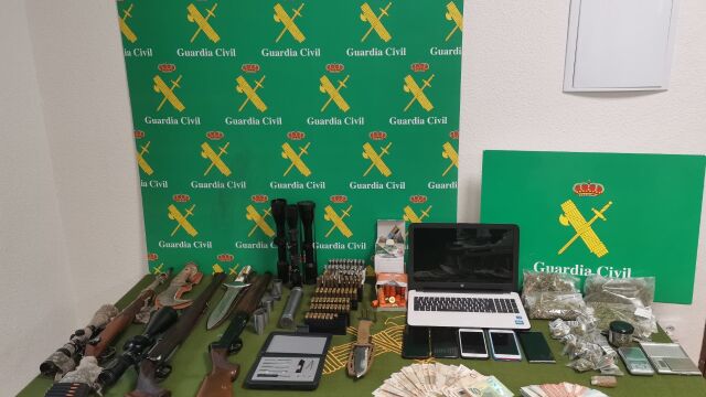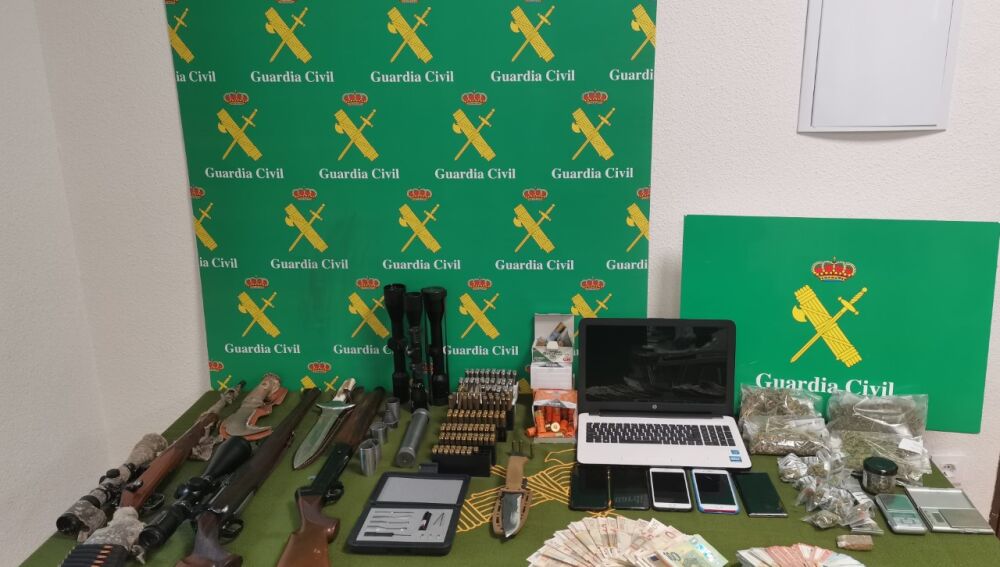 Una vez identificados todos los presuntos autores, se solicitó a la autoridad judicial mandamiento para poder realizar las entradas y registros pertinentes, un total de cuatro, en los que se intervinieron tres armas de fuego y cartuchería, cuchillería de caza de grandes dimensiones, silenciadores y otros efectos relacionados con las armas de fuego; así como por otra parte 300 gramos de marihuana, 25 de hachís, basculas de precisión, teléfonos móviles, 17.395 euros y cuatro vehículos a motor.