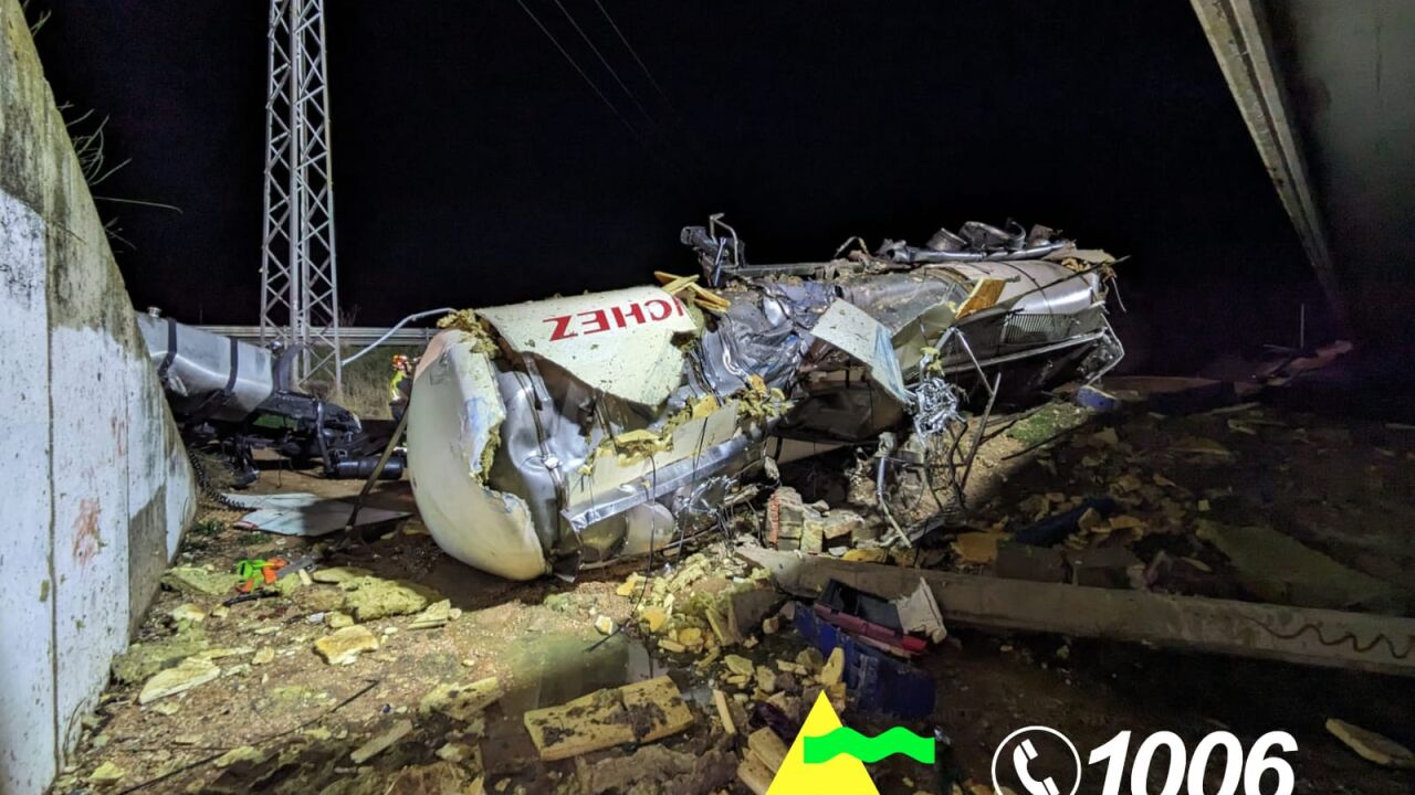 Durante el accidente, la cisterna cargada con hidróxido potásico, cayendo en el cauce de un río seco que transcurre por ese punto, sufriendo una grieta por la que se ha iniciado el derrame.
