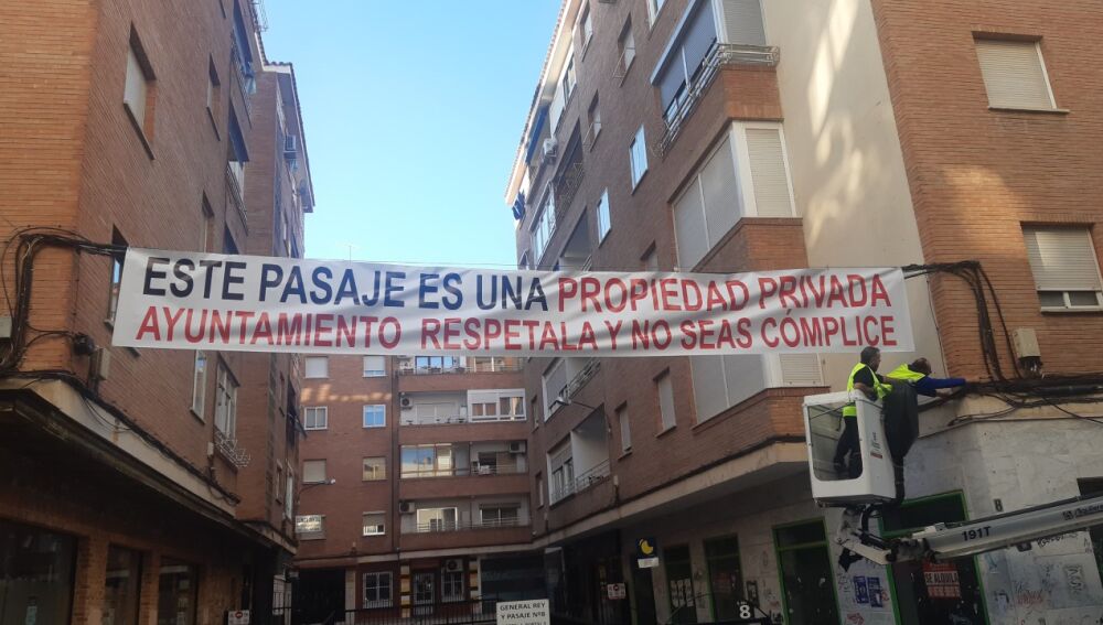 Son 85 las familias que viven en el Pasaje General Rey y desde marzo del año pasado los vecinos mantienen instaladas una serie de pancartas en las que señalan que este pasaje es privado y piden al Ayuntamiento respeto y que no sea cómplice.