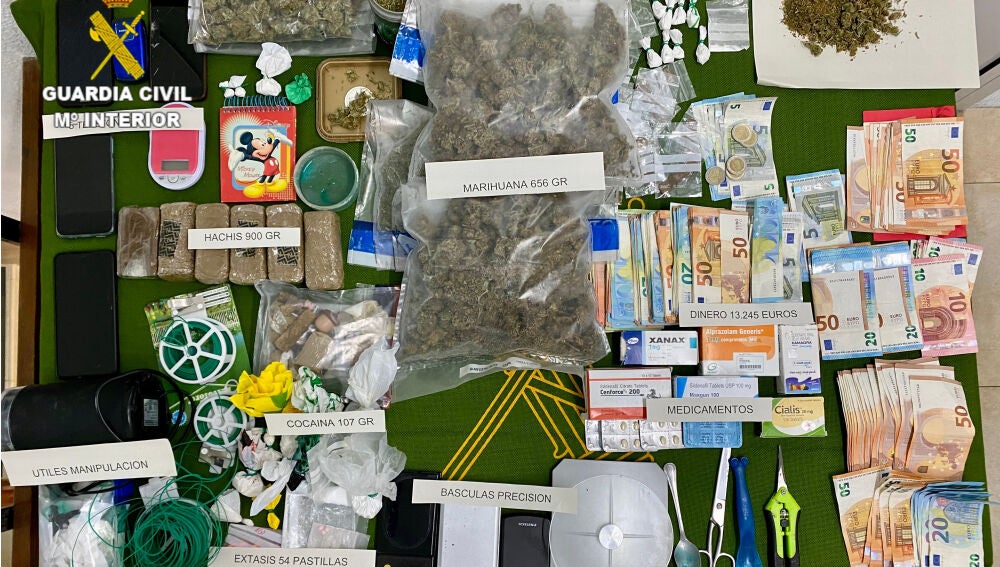 Durante el pasado mes de febrero los agentes realizaron tres registros domiciliarios donde intervinieron 100 gramos de cocaína, casi 600 gramos de marihuana, comprimidos de éxtasis, más de 13.000 euros en dinero en efectivo, básculas de precisión, así como diversas cajas y blíster de medicamentos (varios psicotrópicos) para cuya adquisición en España es necesario receta médica.